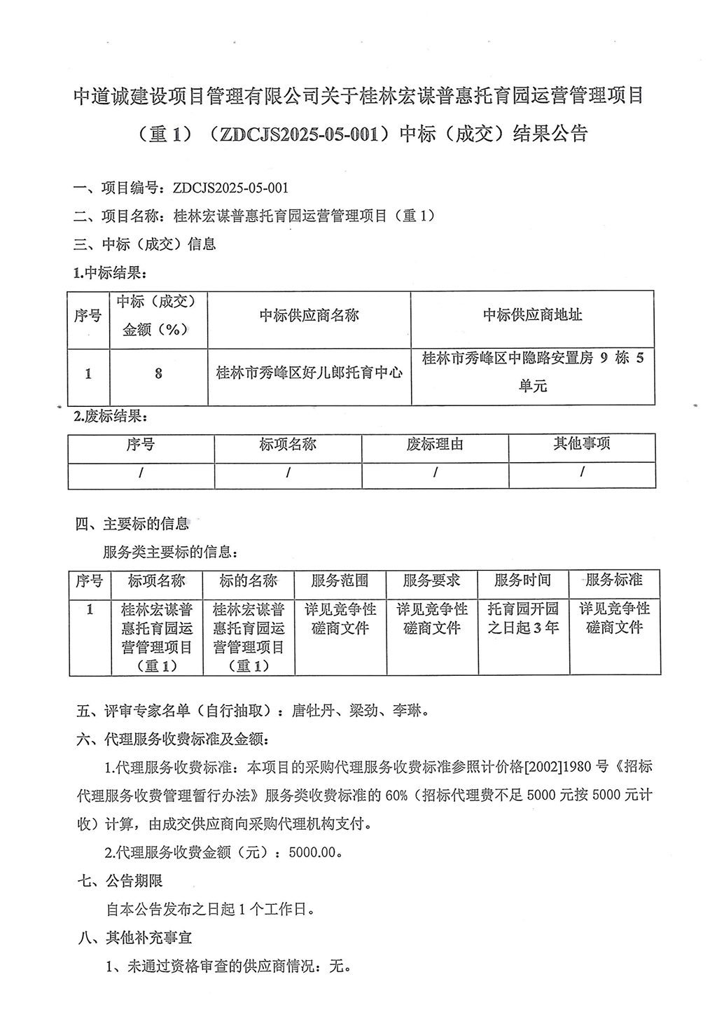 中道誠建設(shè)項(xiàng)目管理有限公司關(guān)于桂林宏謀普惠托育園運(yùn)營管理項(xiàng)目(重1)(ZDCJS2025-05-001)中標(biāo)(成交)結(jié)果公告
