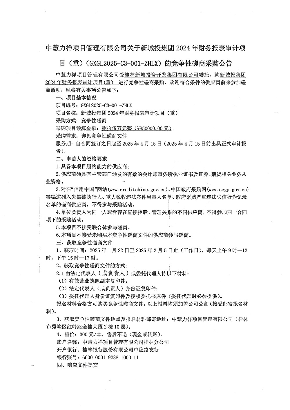 中慧力祥項目管理有限公司關于新城投集團2024年財務報表審計項目(重)(GXGL2025-C3-001-ZHLX)的競爭性磋商采購公告