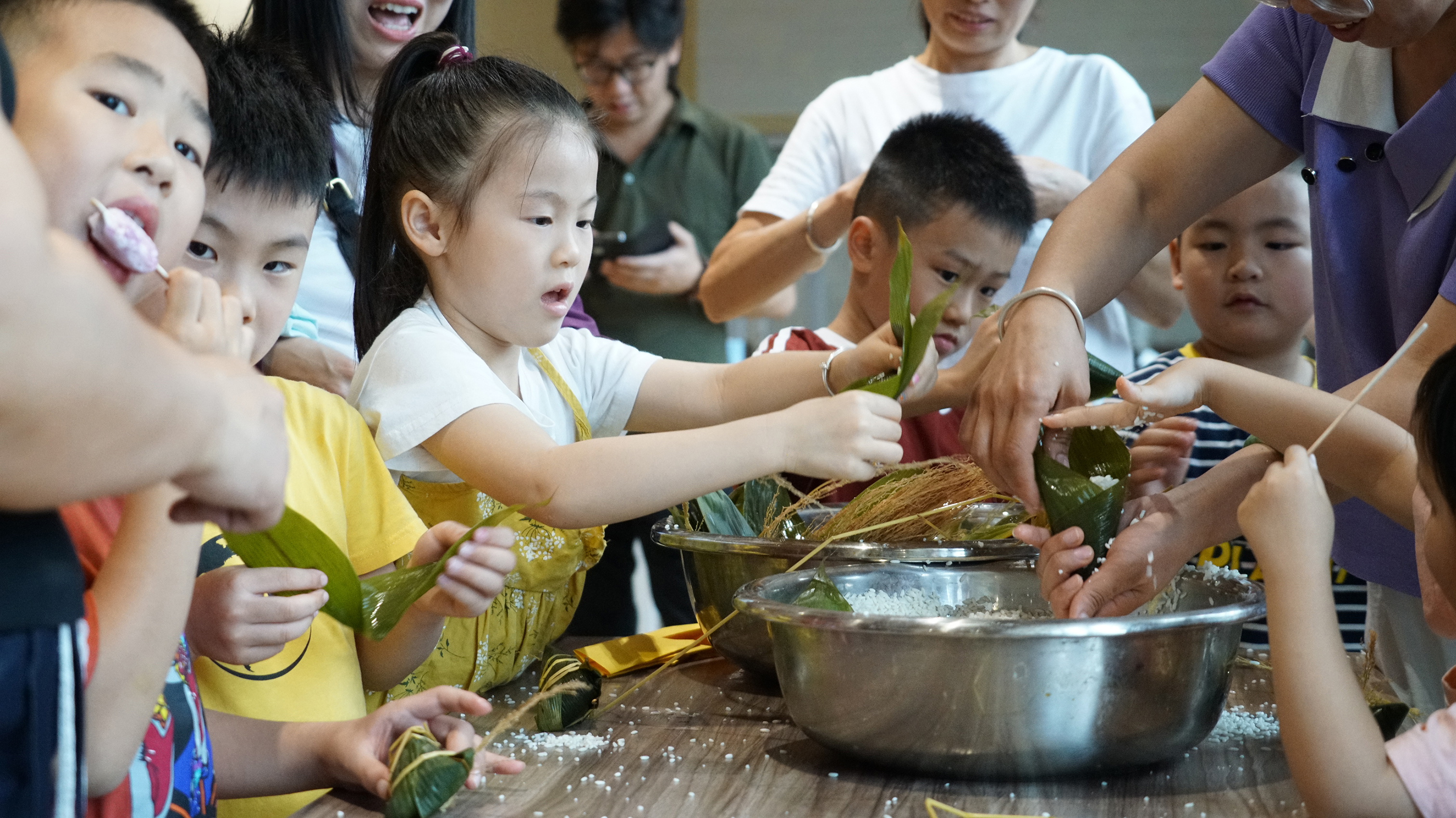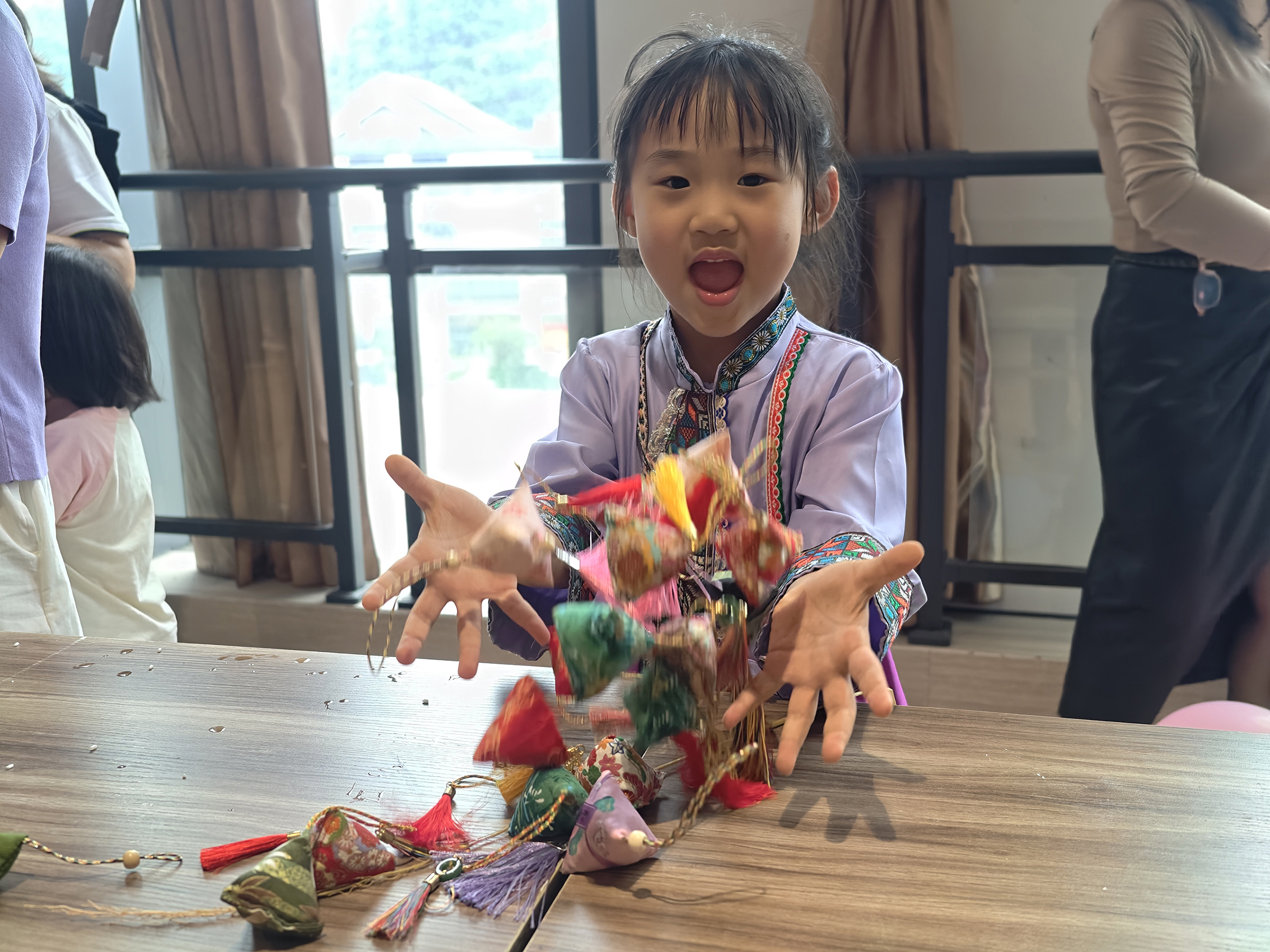 游戲環(huán)節(jié)結(jié)束后,大家開始包粽子、做香囊,孩子們圍著長桌,小手笨拙又興奮地學著大人的模樣包粽子、做香囊,翠綠寬大的粽葉在他們手中顯得有些調(diào)皮,不是卷不成錐形,就是裹不緊邊角。另一邊的角落,則是五彩斑斕的香囊世界,孩子們圍坐在一起,桌上鋪滿了色彩鮮艷的綢布、五彩絲線、亮晶晶的小珠子,還有散發(fā)著濃郁草藥香氣的艾草和菖蒲碎。他們用小手仔細地挑選著心儀的布料,小心翼翼地裁剪成小小的口袋形狀。穿針引線對他們來說是個不小的挑戰(zhàn),小眉頭微微蹙起,線頭有時會調(diào)皮地打結(jié),但他們依然樂此不疲。通過包粽子、做香囊使孩子們深入了解中國各民族在端午節(jié)的悠久歷史和豐富的非遺傳承文化,感受到傳統(tǒng)文化的獨特魅力。